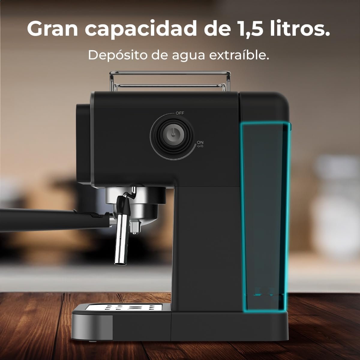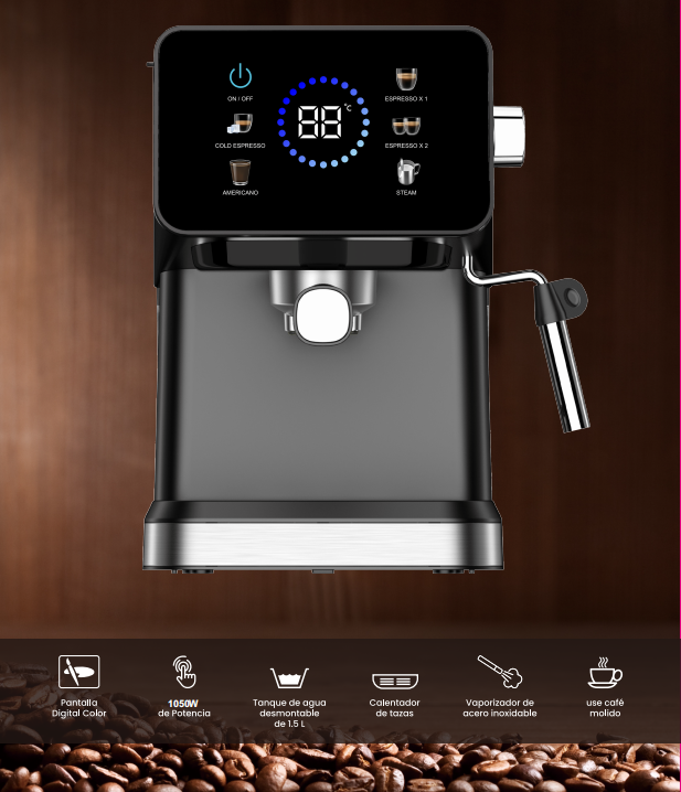 Equipada con 1050W de potencia y 20 bares de presión, esta cafetera garantiza extracciones precisas para resaltar el sabor y aroma de tus cafés favoritos. Su tanque de agua de 1.5L asegura un suministro suficiente para múltiples preparaciones, ideal para reuniones familiares o momentos de disfrute personal.