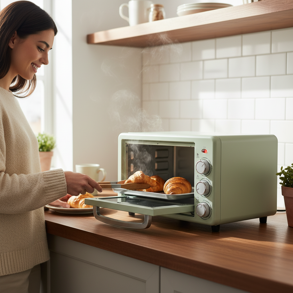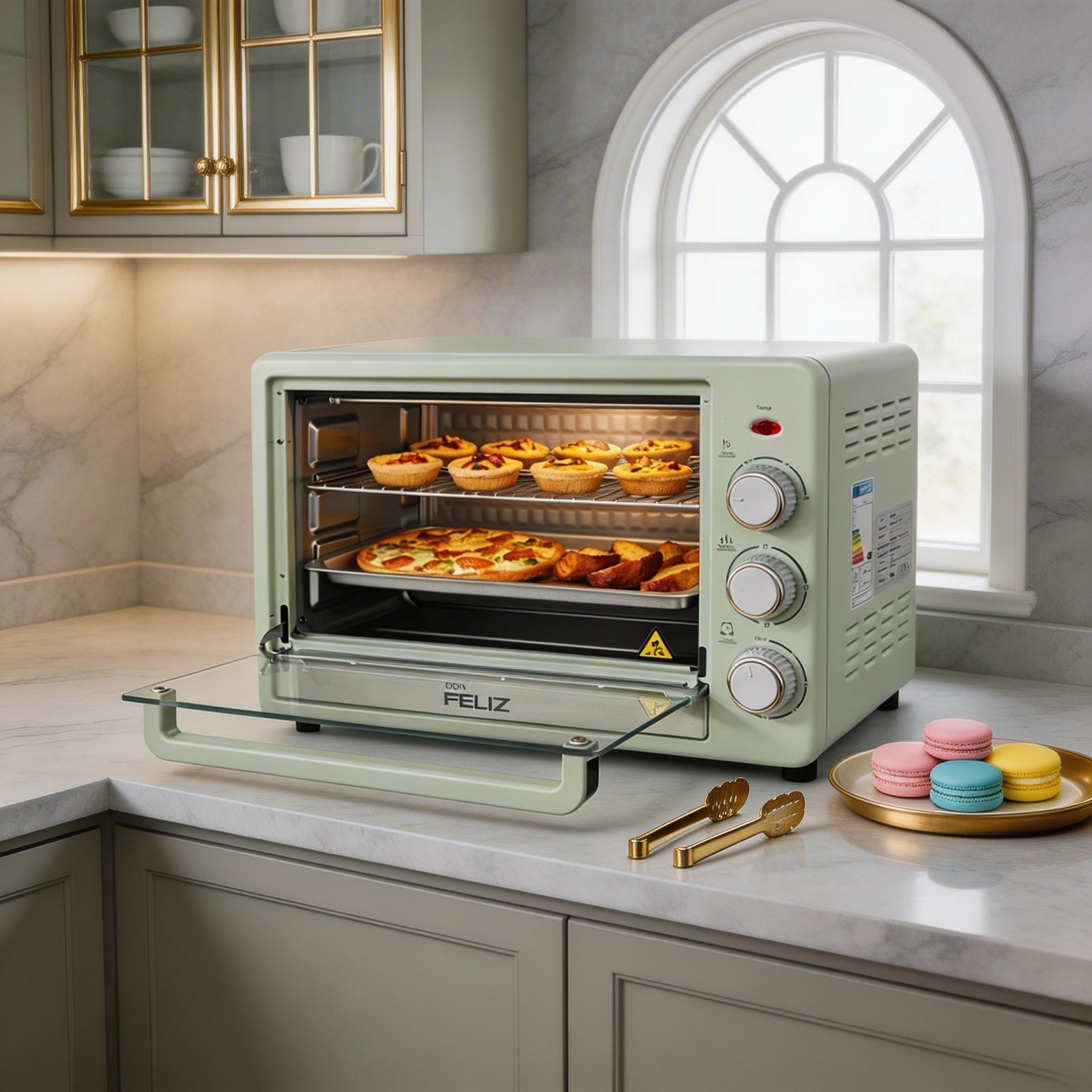 Horno Eléctrico Vertical Compacto 15L, Puerta de Vidrio Transparente, Control de Temperatura Ajustable, Temporizador 60 Minutos, Ideal para Cocina Pequeña, Color blanco y verde
