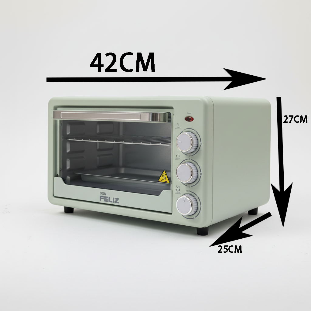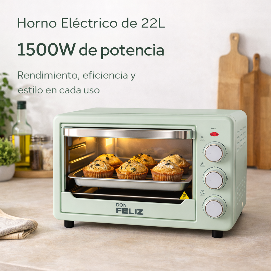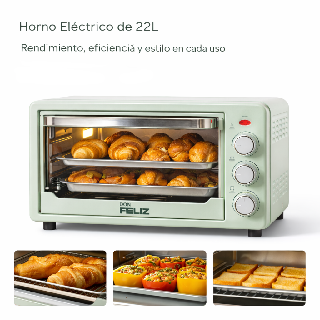 Horno Eléctrico Sobremesa 22L 1500W Negro con Temperatura Hasta 250°C, 3 Modos de Calor, Temporizador 60 Minutos, Incluye Bandeja y Rejilla, Color negro y verde