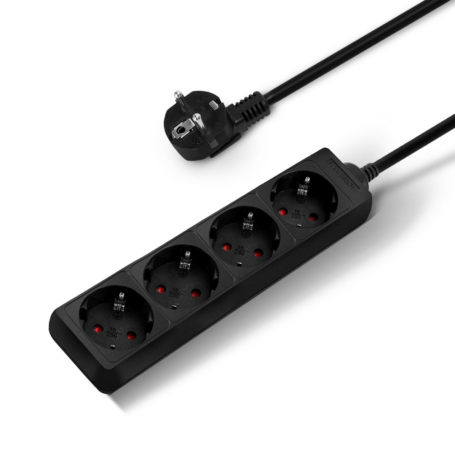 Regleta alargador 4 enchufes Schuko sin interruptor | 16A 250V 3680W | Cable 1,5 m / 3 m / 5 m | Color Negro